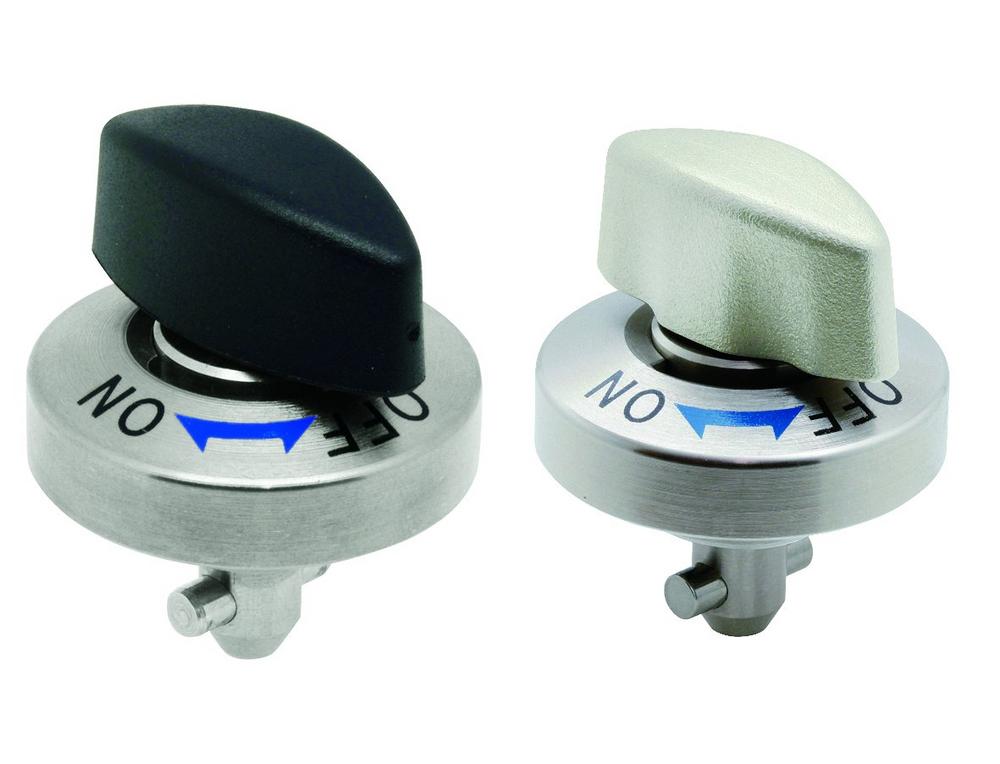 Bei den Drehspannriegeln erfolgt der Verschluss durch eine 90°-Drehbewegung von der Position „OFF“ auf die Position „ON“. Dabei wird ein mit dem Griff verbundener Querstift in eine Spannplatte eingeschoben. Der Stift greift in die Platte ein und klemmt die Komponenten fest aneinander. Ein Klick signalisiert das Schließen bzw. – bei umgekehrter Drehbewegung – das Öffnen. KIPP bietet den Drehspannriegel auch als flache Ausführung an. Die Drehknöpfe der Verschlusselemente sind aus Thermoplast oder Edelstahl gefertigt, während das Gehäuse aus vernickeltem Stahl besteht. Die passenden Spannplatten für Drehspannriegel sind separat erhältlich.