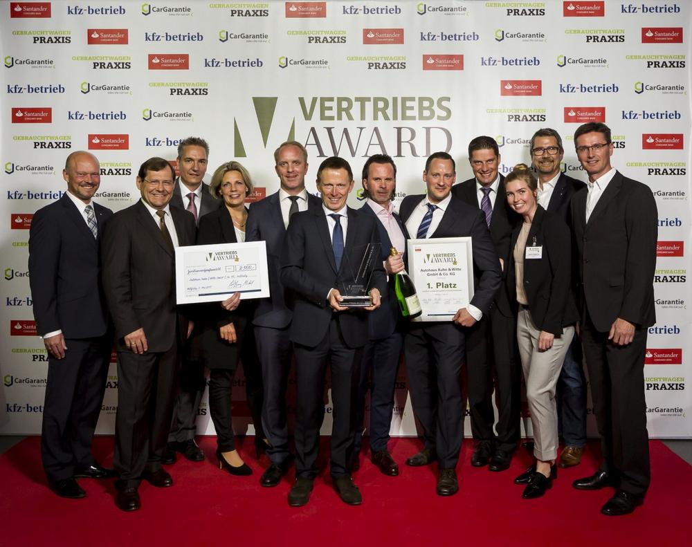 Die besten Autohandelsbetriebe Deutschlands stehen fest. Ganz oben im Ranking des Vertriebs Awards 2017 steht das Autohaus Kuhn & Witte aus Jesteburg (Volkswagen und Audi). Prägnante Vertriebsideen, strikte Prozessorientierung und ausgeprägte Kundenorientierung überzeugte die Jury. Die Redaktionen der Fachzeitschriften „kfz-betrieb“ und „Gebrauchtwagen Praxis“ haben zusammen mit den Sponsoren Car Garantie und Santander Consumer Bank am Mittwoch, den 3. Mai 2017, die markenübergreifende Auszeichnung vergeben. Insgesamt kürten sie die elf innovativsten Betriebe im deutschen Kraftfahrzeughandel.
