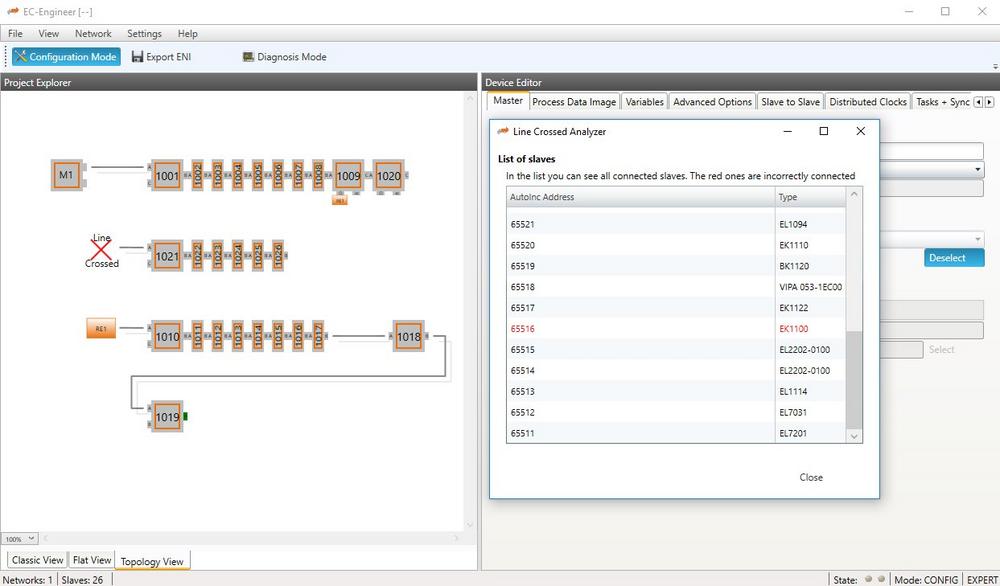 A common mistake is to swap the in/out ports over and over even clearly marked. The information where exactly a swap took place provides the well-proven EtherCAT Master EC-Master. Accidentally incorrectly connected slaves are marked with the corresponding symbol in the network topology and can thereby be recognized immediately.