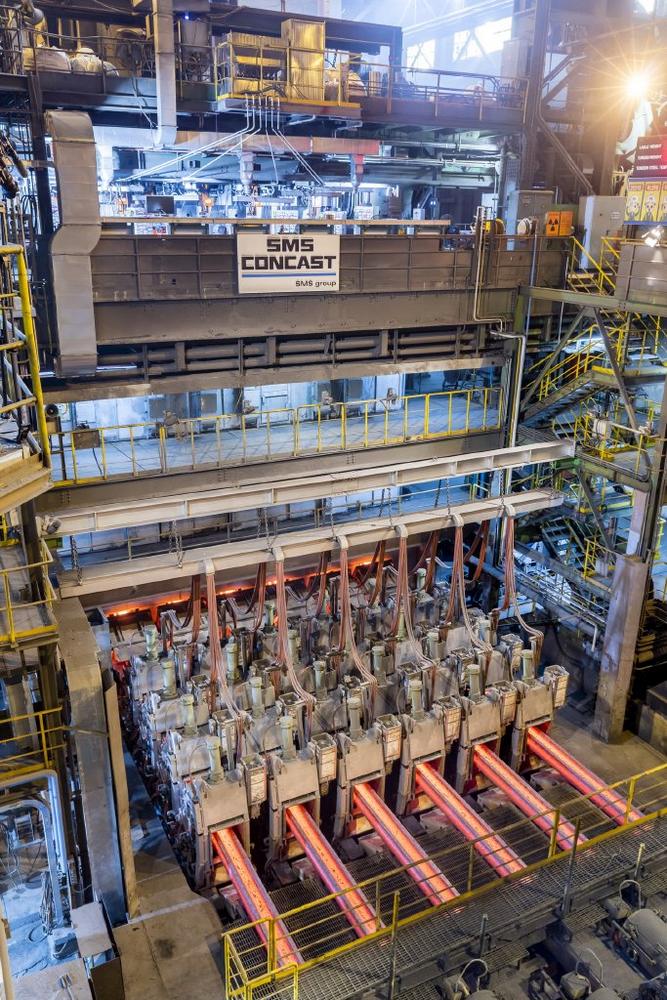 Mit einem Gieβradius von zehn Metern produziert die sechssträngige Kombi-Gießanlage rund eine Million Tonnen pro Jahr. Die Stahlgüten reichen von Kohlenstoff- bis Automobilstahl und werden in unter­schiedlichen Vorblock- und Beam Blank-Formaten gegossen.