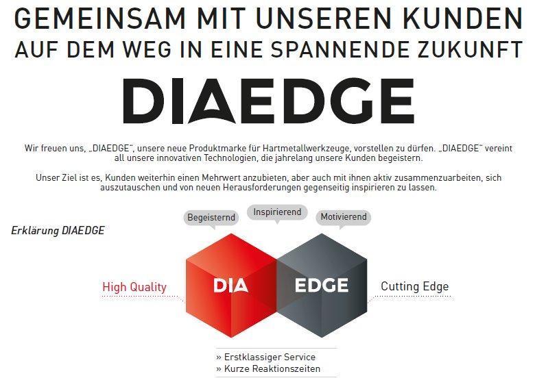 „DIAEDGE" ist eine Kombination aus den Wörtern „DIAMOND" und „EDGE", die die erstklassige Qualität der Produkte und die innovativen, zukunftsweisenden Technologien von Mitsubishi Materials repräsentieren. „DIAEDGE" verbindet das hochwertige Image der Diamanten, die weltbekannten drei Diamanten von Mitsubishi und die innovativen Technologien in einem einzigen Wort. Die Einführung eines einheitlichen, länderübergreifenden Markennamens setzt für das Unternehmen ein Zeichen für Globalität, Vertrauen und Kundennähe.