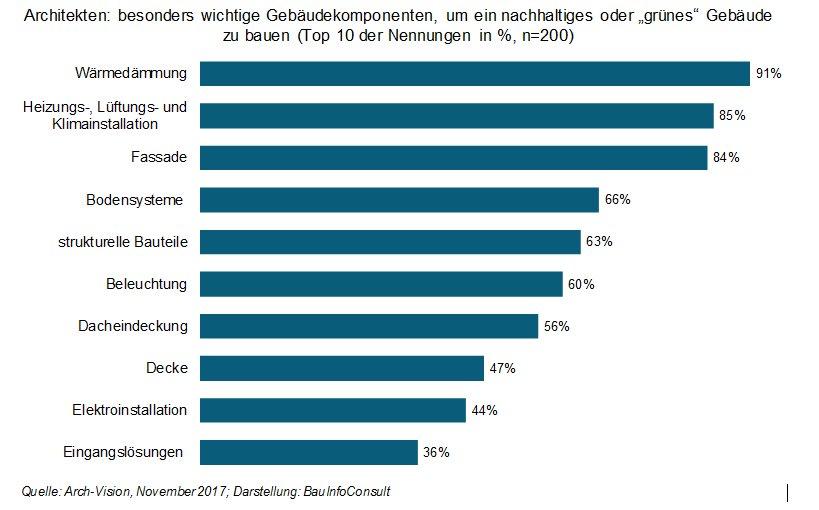 Auch wenn Nachhaltigkeit eher als ganzheitliches Konzept aufgefasst wird, zeigt sich in der Baupraxis, dass bei diesem Thema oft in einzelnen Gebäudeteilen gedacht wird. So sind 91 Prozent der deutschen Planer der Meinung, dass beim Bau eines „grünen“ Gebäudes gerade die Wärmedämmung das wichtigste Bauteil ist. Etwa 8 von 10 befragten Architekten sehen zusätzlich die Heizungs-, Lüftungs- und Klimainstallation (85 Prozent) sowie die Außenfassade (84 Prozent) als maßgeblich nachhaltige Komponente an. Dabei dürften die Planer bei der Installationstechnik wohl eher den energiesparenden Aspekt der Nachhaltigkeit im Hinterkopf haben.