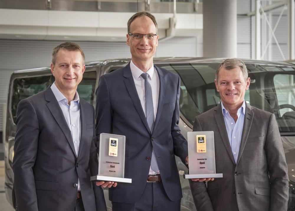 Der Opel Insignia und der Opel Vivaro Life sind „Helden der Digitalisierung“ – denn genauso nennen Auto Bild und Computer Bild die Preisträger der „Connected Car Awards 2017“. Knapp 15.000 Leser der beiden Fachzeitschriften haben abgestimmt und gleich zwei Opel-Modelle zu diesen Helden gewählt: Mit bester Rundum-Vernetzung kürten sie das Opel-Flaggschiff Insignia zum „Connected Car“. In der erstmals ausgelobten Kategorie „Connected Reisemobil“ sieht das Publikum den neuen Großraum-Van Opel Vivaro Life dank Navi 80 IntelliLink inklusive Real Time-Verkehrsinformationen ganz vorn. Heute nahm Opel-Chef Michael Lohscheller beide Auszeichnungen im Adam Opel Haus in Rüsselsheim vom General Manager der Auto Bild-Gruppe Stephan Fritz und stellvertretenden Auto Bild-Chefredakteur Tomas Hirschberger entgegen.