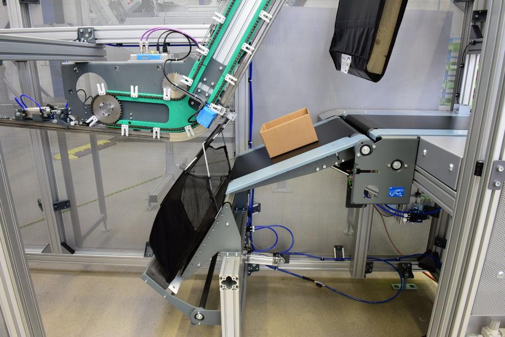 Skyfall technology’s great adaptability to a wide range of application areas rests largely on individual hangers that hitch up not only with pockets, but also with load carriers designed for all manner of other items such as cans, cartridges or vehicle components. Of course, producing customized versions is no problem either. Further benefits of Skyfall overhead conveyors: just a slight gradient plus gravity suffice to get the frictionless shuttles rolling, so no electric drives are needed on downhill stretches. Moreover, thanks to spatial flexibility they can make optimum use of structural conditions around factory equipment. Even with a complex installation, larger areas of floor space stay completely clear for use by production and packaging or for people to move around. What’s more, any system scales easily.