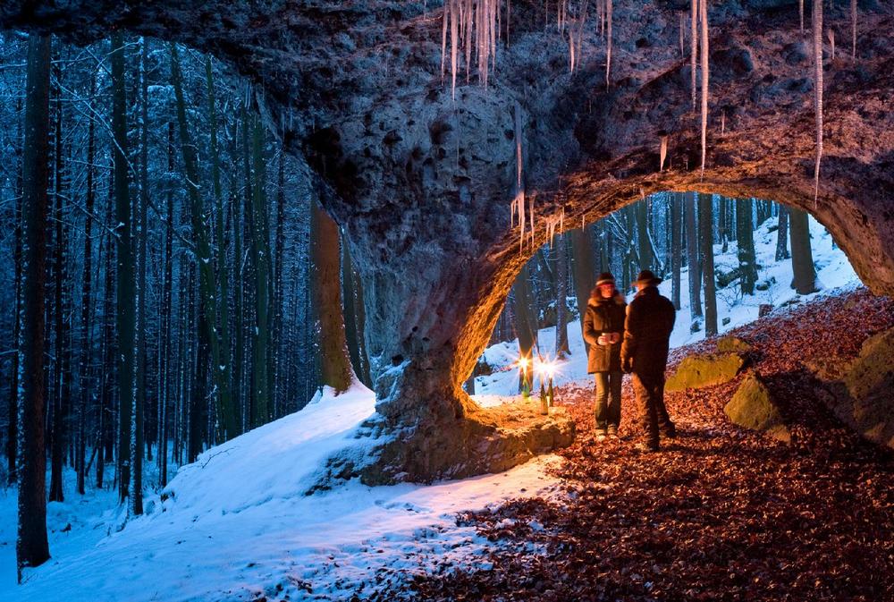 Sobald die winterlichen Temperaturen nach Bayern zurückkehren, verzaubert eine Felsformation im Bayerischen Jura wieder ihre Besucher: Wegen der Eisbildungen gilt das Naturdenkmal Geiskirche unweit des Ortes Peilstein-Neukirchen im Landkreis Amberg-Sulzbach in der Oberpfalz besonders auch in den kalten Monaten als Attraktion unter Touristen. Die nach zwei Seiten offene Felsenhalle ist bis zu 20 Meter lang, bis zu 13 Meter breit und mehr als drei Meter hoch. Traditionell dienst sie Tieren zum Schutz. Die hallenartige Höhle gilt bei Einheimischen aber auch Touristen als beliebter Treffpunkt für Feste und auch romantische Begegnungen.