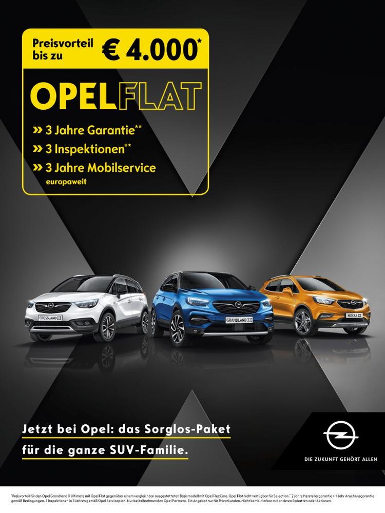 Die „Opel Flat“ ist back: Ab sofort fahren Kunden, die sich einen neuen Opel-Pkw zulegen, rundum sorglos. Wie schon bei der ersten Opel Flat im vergangenen Jahr kommen Neuwagenkäufer in den Genuss eines Komplettpakets, das 3 Jahre Garantie[1], 3 Inspektionen[2] und 3 Jahre europaweiten Mobilservice umfasst – bei nun noch mehr Opel-Modellen. Denn das Sorglos-Paket gilt jetzt auch für die komplette SUV-Familie aus Grandland X, Crossland X und Mokka X – Kundenpreisvorteil bis zu 4.000 Euro inklusive. Oder wie es Markenbotschafter Jürgen Klopp im Radio formuliert: „Man denkt ja immer, die verrücktesten Angebote kommen aus Madrid, Barcelona oder Manchester. Aber das Verrückteste derzeit, das kommt aus Rüsselsheim – nennt sich Opel Flat.“