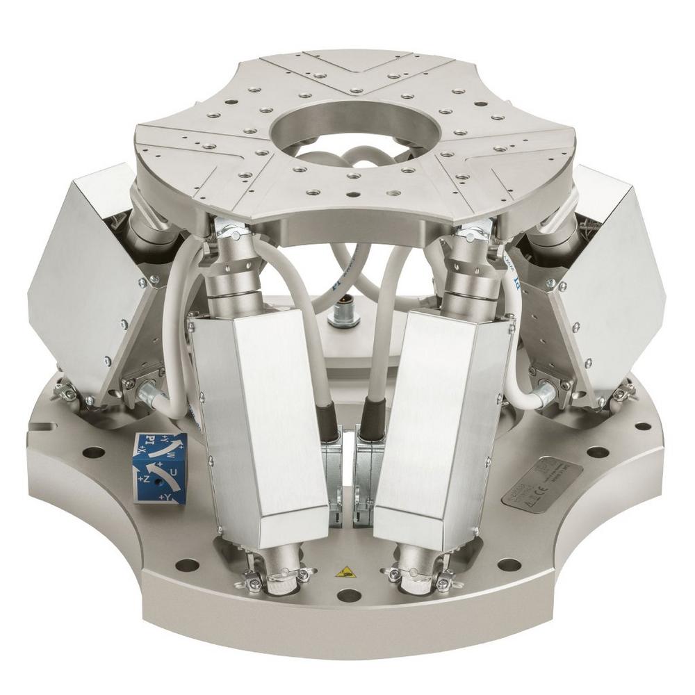 The parallel-kinematic positioning system works with brushless DC motors. These are particularly suitable for high rotation speeds, can be controlled very accurately, and ensure high precision. Because they dispense with sliding contacts, they run smoothly, are wear-free, and achieve a long lifetime. Absolute encoders, which provide clear position information even when powered off, make reference moves superfluous, therefore improving the efficiency and safety during operation. The drives have been "folded" to achieve a compact design. Therefore, the hexapod has a height of just 195 mm with a diameter of 320 mm and it can position loads of up to 30 kg precisely, quickly, and over long operating times. It is suitable for travel ranges to ±27.5 mm and rotation ranges to ±11.5°. The minimum incremental motion is 0.3 μm in the X, Y, and Z axis with repeatability to ±0.1 μm or ±2 μrad.