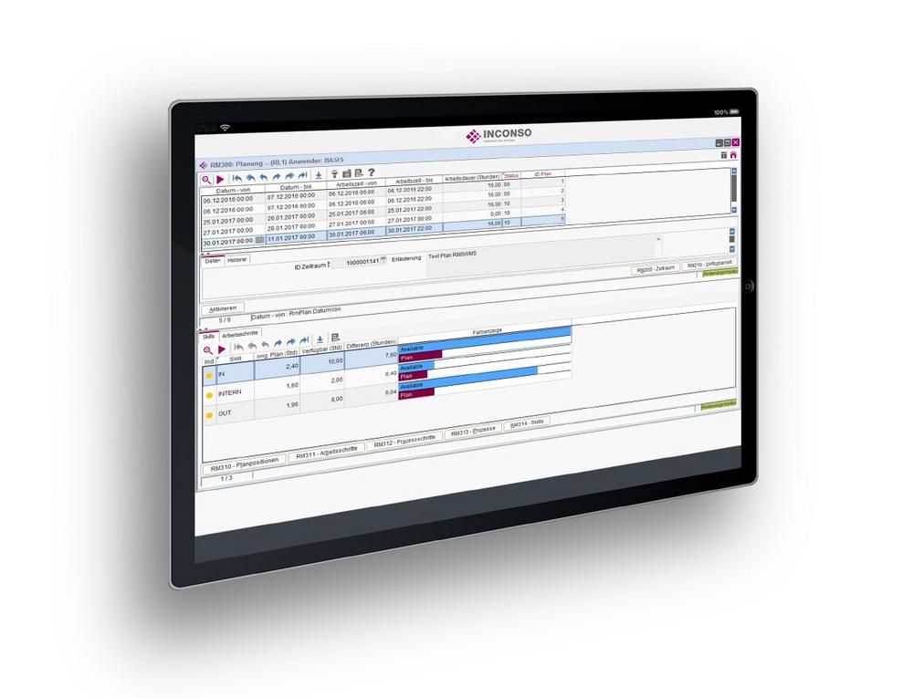 Zu Planungszwecken bieten die Kernfunktionalitäten des inconsoRMS einen umfassenden Überblick über vorhandene Ressourcen wie Mitarbeiter und Betriebsmittel je nach bestehendem Auftragsvorrat und Zeitrahmen. Das Add-on ermittelt in Echtzeit die tatsächliche Auslastung im operativen Betrieb, stellt diese der Planung gegenüber und bindet Betriebskalender, Schichtpläne und Qualifikationen einzelner Mitarbeiter ein. Die aktuelle Auslastung bildet inconsoRMS in frei konfigurierbarer Detailtreue ab. Eine flexible Ressourcensteuerung insbesondere bei täglich variierenden Auftragslagen wird über moderne, anwenderfreundliche Oberflächen unterstützt.