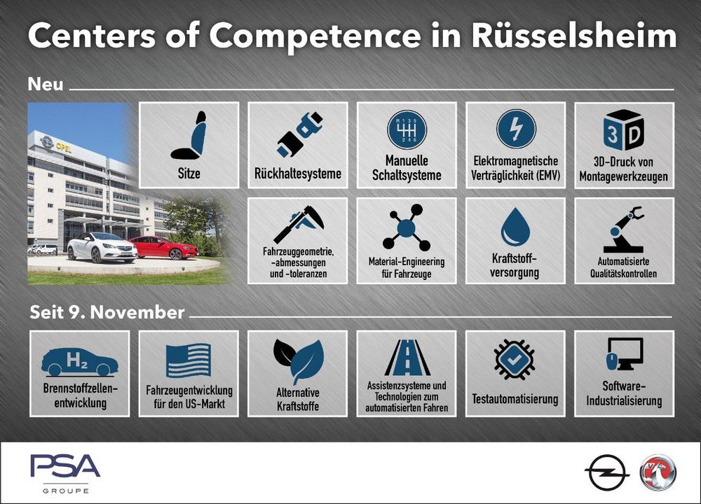Innerhalb kürzester Zeit haben die Entwicklungsteams aus Frankreich und Deutschland weitere F&E-Bereiche definiert, um das volle Leistungspotenzial im Gesamtkonzern freizusetzen. In einem globalen Netzwerk ergänzen sich die Fähigkeiten der verschiedenen Kompetenzteams ideal – davon profitieren alle fünf Konzernmarken (Opel, Vauxhall, Peugeot, Citroën und DS Automobiles). Die Centers of Competence ermöglichen einheitliche technische Standards und die optimale Umsetzung innerhalb der Groupe PSA auf der ganzen Welt.