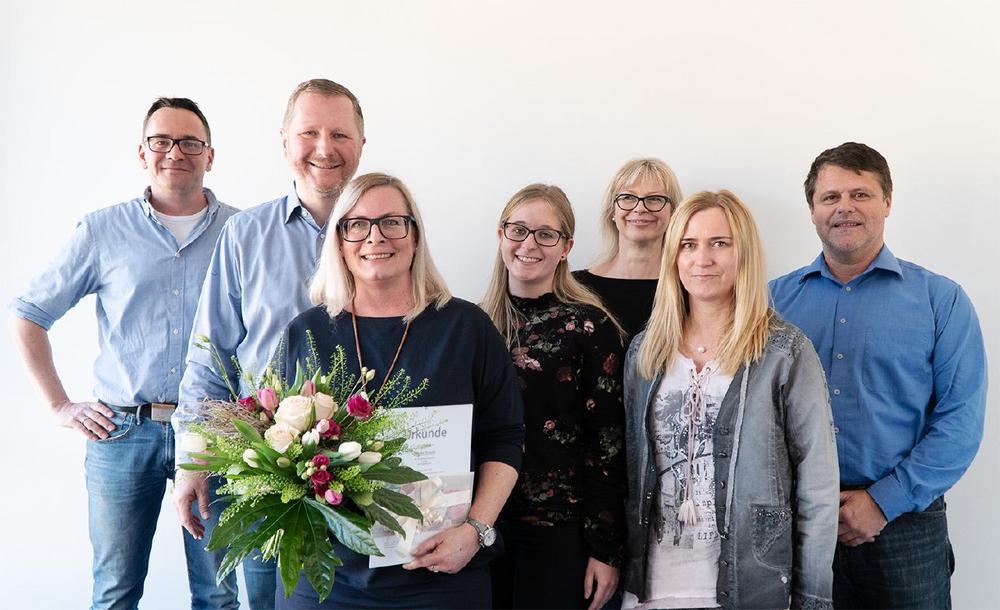 Neben einer Urkunde und einem Strauß Blumen erhielt Nicole Kraus von den Vorständen des Unternehmens einen Gutschein, um sich einen großen Wunsch zu erfüllen.