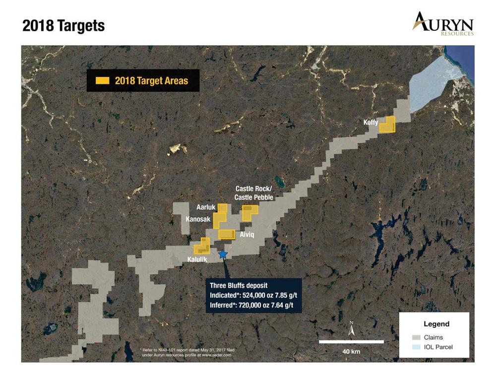Ursprünglich wurden die Proben im Rahmen des Explorationsprogramms Sommer 2017 zur Auswertung mit einem tragbaren Analysegerät (Röntgenfluorszenz) gesammelt. Nach Vorliegen der Ergebnisse aus dem Entdeckungsbohrloch Aiviq (12,2 Meter mit 4,7g/t Au) übermittelte Auryn die Geschiebemergelproben aus der hochauflösenden Messung zur Goldanalyse (ICP) an ALS Laboratories. Die Goldanalyse ergab, dass sich das hochgradige Entdeckungsbohrloch räumlich mit den Goldwerten der Geschiebemergelproben aus der hochauflösenden Messung überschneidet. Außerdem konnten anhand dieser Ergebnisse Zielzonen genauer definiert werden, die 2017 nicht ausreichend bebohrt worden waren (Abbildung 2).
