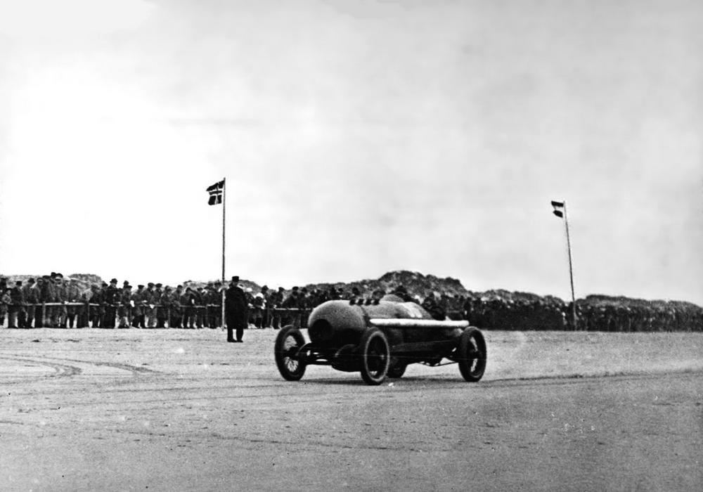 Genau das passende Ambiente für das „Grüne Hubraum-Monster“ aus Rüsselsheim, das hier an die Erfolge der früheren Strandrennen erinnert und diese fortsetzen will. Beste Voraussetzungen bringt der 12,3-Liter-Bolide mit, der 1914 bereits mit fortschrittlicher Vierventiltechnik und obenliegender Nockenwelle mit Königswellenantrieb vorfährt. Aufgrund der enormen Bauhöhe des Triebwerks ragen die Ventilfedern durch 16 Löcher ins Freie. Die Kolben toben mit satten 24 Metern pro Sekunde – das entspricht 86 km/h – Formel-1-gleich durch die Brennräume. Der Motor mobilisiert insgesamt 260 PS. Damit fährt der Rennwagen bis zu rund 230 km/h schnell über die Pisten – und lässt in den 1920er Jahren sogar den späteren Geschwindigkeitsrekordler Malcolm Campbell hinter sich.