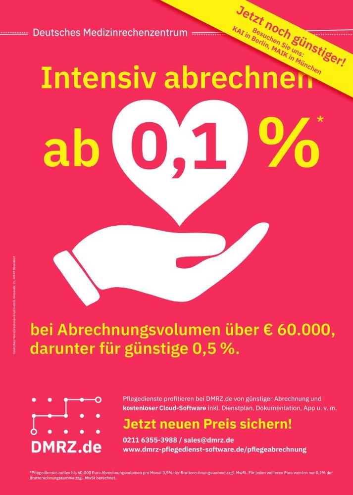 Für umfassende Informationen und eine persönliche Beratung stehen DMRZ.de-Mitarbeiter auf dem KAI in Berlin am Stand 84 (Coubertin-Lounge, Ebene -1) und auf dem MAIK am Stand 49 (Forum 9/10/11) bereit. Mit dem neuen Preismodell sollen besonders Intensiv-Pflegedienste angesprochen werden, die häufig Umsätze im dreistelligen Bereich erzielen: Für jeden weiteren Euro über 60.000 Euro Auftragsvolumen im Monat fallen für die Abrechnung nur noch 0,1 Prozent der Rechnungssumme an. Bis 60.000 Euro wird weiterhin für 0,5 Prozent abgerechnet – per DTA mit allen Kostenträgern (jeweils der Bruttorechnungssumme zuzüglich Mehrwertsteuer).
