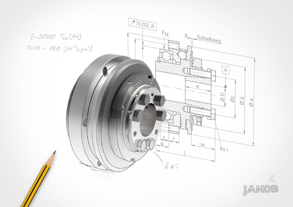 Mit dem Typ SKY bietet JAKOB Antriebstechnik eine Sicherheitskupplung für indirekte Antriebe zur Überlastbegrenzung bzw. zum Kollisionsschutz, die den modernsten Anforderungen gerecht wird. Sie bietet hohe Ausrückmomente bis 9000 Nm bei einer sehr kompakten Bauweise. Durch die Konus-Klemmbuchse ist sie einfach zu montieren. Große Wellen- bzw. Bohrungsdurchmesser, eine hohe mögliche Lagerbelastung und die ausgezeichnete Rundlaufgenauigkeit runden das Konzept ab. Durch die Verwendung von hochfestem Vergütungsstahl mit Randschichthärtung bzw. Plasmabeschichtung der relevanten Funktionsflächen konnten besonders hohe Ausrückmomente realisiert werden.