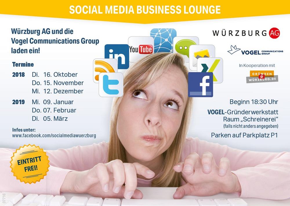 Veranstaltungsort ist die Vogel-Gründerwerkstatt, Raum „Schreinerei“, auf dem Vogel Campus (Max-Planck-Str. 7/9, Würzburg). Beginn jeweils um 18:30 Uhr. Parkmöglichkeiten und Zugang finden Sie auf dem Parkplatz P1. Die Würzburg AG und die Vogel Communications Group laden alle Interessierten herzlich zu dieser Veranstaltung ein! Der Eintritt ist frei. Eine Anmeldung ist nicht nötig. Das aktuelle Programm findet sich auf der Facebookseite Social Media Business Lounge.