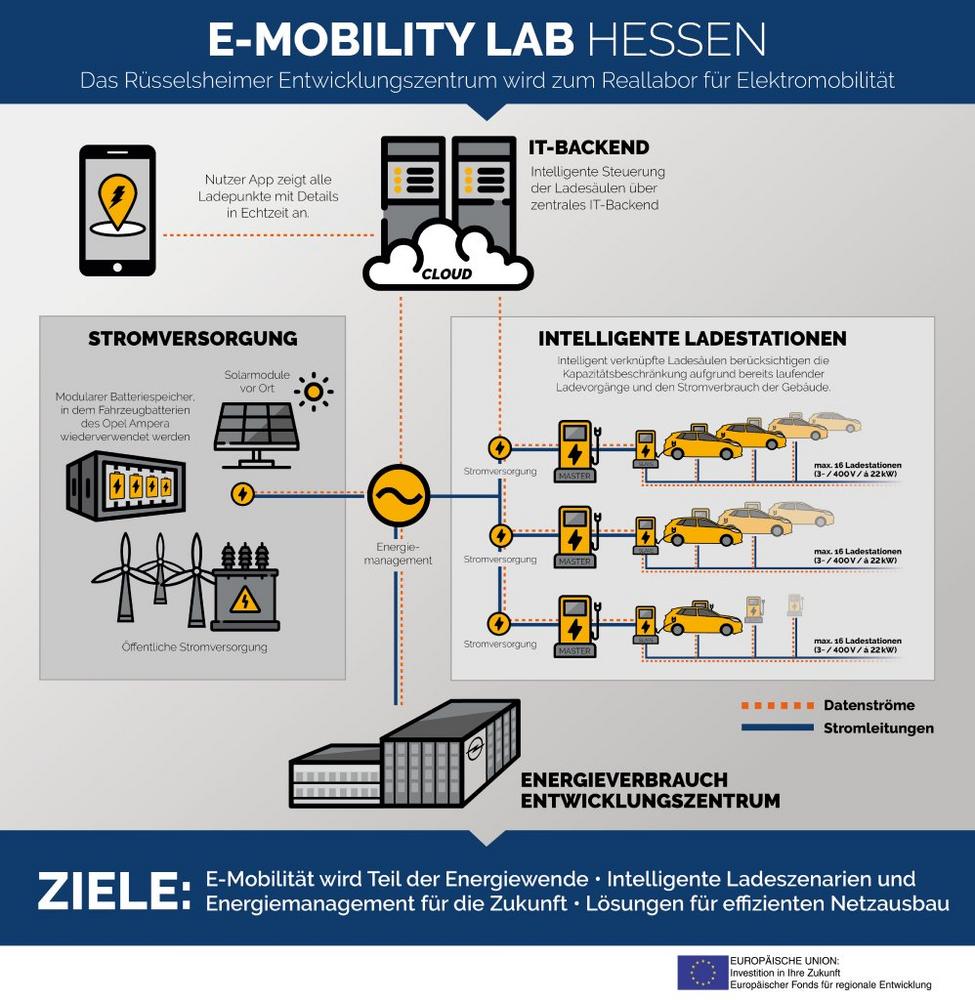 Das Entwicklungszentrum am Stammsitz Rüsselsheim wird zum Reallabor für Elektromobilität: Opel wird dort gemeinsam mit der Universität Kassel sowie den beiden auf Ladeinfrastruktur spezialisierten Unternehmen FLAVIA IT und PLUG’n CHARGE am optimalen Aufbau des Stromnetzes der Zukunft forschen. Das dreijährige Zukunftsprojekt „E-Mobility-LAB Hessen“ soll durch das Hessische Ministerium für Wirtschaft, Energie, Verkehr und Landesentwicklung mit Mitteln des Europäischen Fonds für regionale Entwicklung (EFRE) gefördert werden. Dafür errichtet Opel in seinem Entwicklungszentrum ein intelligentes Lade- und -Infrastruktursystem für Elektrofahrzeuge. Die Installation der ersten Ladesäulen auf dem Opel-Gelände in Rüsselsheim sowie dem Testzentrum in Rodgau-Dudenhofen startet schon in wenigen Monaten.