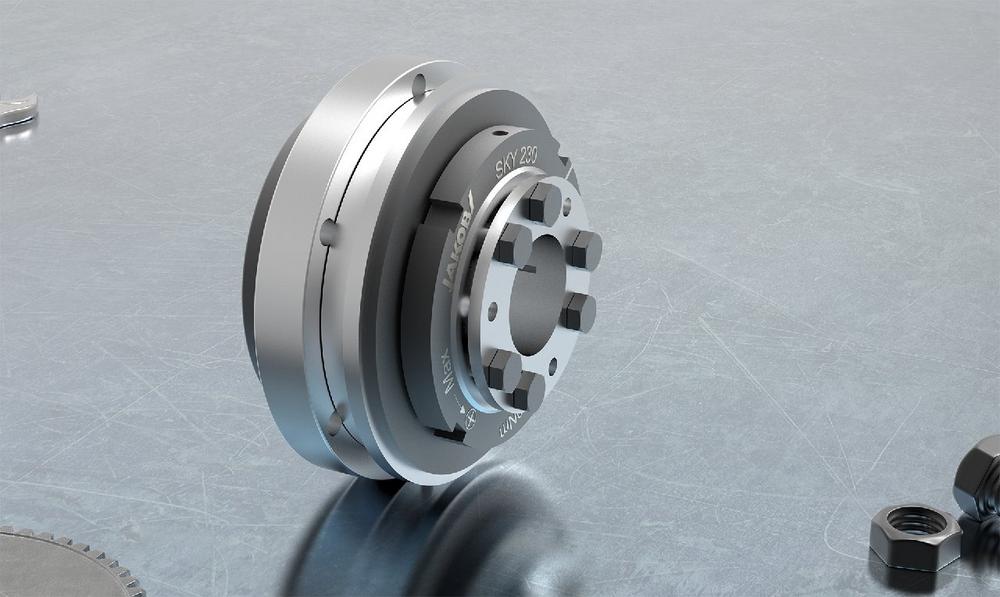 Mit dem Typ SKY bietet JAKOB Antriebstechnik eine Sicherheitskupplung für indirekte Antriebe zur Überlastbegrenzung bzw. zum Kollisionsschutz, die den modernsten Anforderungen gerecht wird. Sie bietet hohe Ausrückmomente bis 9000 Nm bei einer sehr kompakten Bauweise. Durch die Konus-Klemmbuchse ist sie einfach zu montieren. Große Wellen- bzw. Bohrungsdurchmesser, eine hohe mögliche Lagerbelastung und die ausgezeichnete Rundlaufgenauigkeit runden das Konzept ab. Durch die Verwendung von hochfestem Vergütungsstahl mit Randschichthärtung bzw. Plasmabeschichtung der relevanten Funktionsflächen konnten besonders hohe Ausrückmomente realisiert werden.