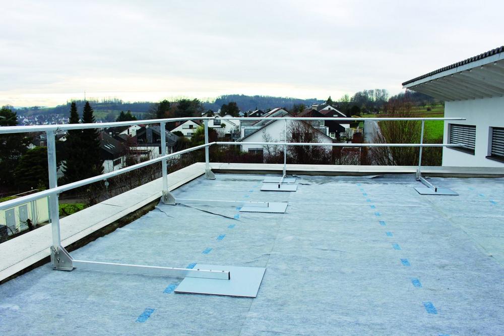 Dieses leichte und schnell zu montierende Schutzgeländer aus Aluminium benötigt keinerlei Dachdurchdringungen zur Fixierung.