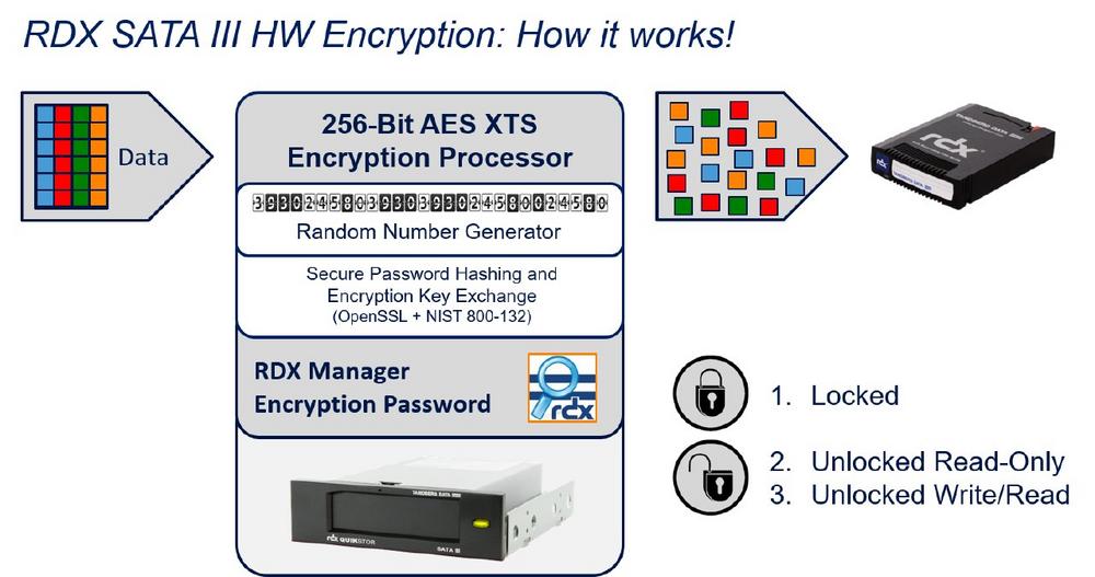 Die FIPS 140-2-validierte Verschlüsselung ist kostenlos für interne RDX SATA III-Laufwerke erhältlich und unterstützt sämtliche verfügbaren RDX-Medien. FIPS 140-2 beschreibt die Verschlüsselung und die zugehörigen Sicherheitsanforderungen, die IT-Produkte zur vertraulichen Nutzung erfüllen sollen. Damit ein Produkt dem Standard FIPS 140-2 Validated entspricht, muss es dessen Vorgaben zu Design und Umsetzung erfüllen und von einem unabhängigen und durch NIST (National Institute of Standards and Technology) akkreditierte Labore getestet und genehmigt werden.