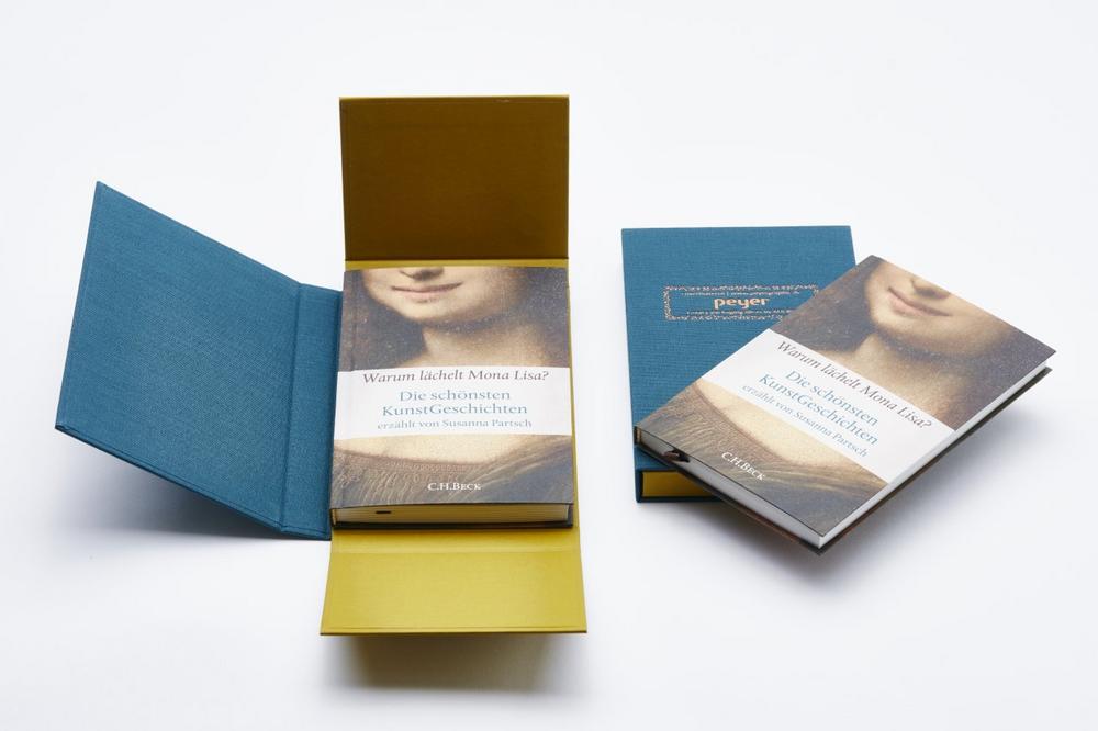 Interessant an der Buch-Box ist neben der durchdachten Konstruktion auch die Kombinationsfreundlichkeit von Materialien und Farben. Schön an der vorliegenden Verpackung ist die Zweifarbigkeit. Die außenliegende Decke besteht aus dem Gewebe BARONESSE petrol, die innenliegende Decke wurde aus SURBALIN glatt in senfgelb angefertigt. So wirken nicht nur die Farben. Man spürt auch den haptischen Unterschied der einzelnen Einbandarten. Die Farbkombination von senfgelb und petrol wirkt sehr modern, weil sie einen Touch ins Retrodesign hat. Gleichzeitig greift sie die Farbgestaltung des innenliegenden Büchleins „Warum lächelt Mona Lisa“ von Susanna Partsch auf. Die Autorin erläutert in anschaulichen Essays die Hintergründe bekannter Kunstwerke. Der Titel ist im Verlag C.H.Beck erschienen.