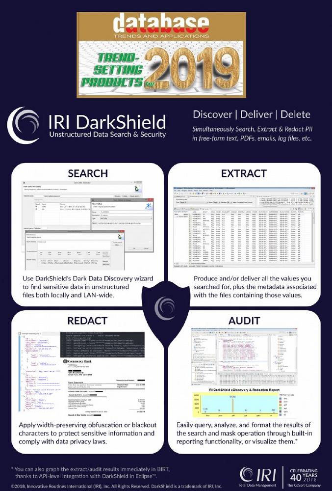 DBTA beschrieb DarkShield als ein Produkt, das "die Suche, Korrektur, Extraktion und Berichterstattung sensibler Daten in unstrukturierten Dateien, die in mehreren Formaten und Ordnern über ein Netzwerk verteilt sind, konsolidiert, multi-threadt und eine einzige benutzerfreundliche Schnittstelle bietet, um alles auf einmal oder in geplanten Schritten durchzuführen". IRI veröffentlichte die ersten beiden Versionen von DarkShield im Jahr 2018 und arbeitet an der dritten Version, um unstrukturiertere Dateiformate anzusprechen!