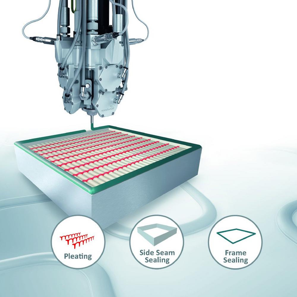 Der Dichtungsspezialist Sonderhoff, Hersteller von 2-Komponenten Schaumdichtungen, Klebstoffen und Vergussmassen sowie Misch- und Dosieranlagen, präsentiert zur Messe vor allem die Vorteile des geschäumten Filterklebstoffs der Fermadur-Serie. Dieser Klebdichtstoff verklebt das gefaltete Filterpaket mit den Innenseiten des Filterrahmens. Der Auftrag des Klebdichtstoffs erfolgt vollautomatisch, konturgenau und prozesssicher mit der Dosierzelle SMART-M. Aufgrund der aufgeschäumten Zellstruktur und der dadurch geringeren Dichte erzielt das Produkt eine hohe Wirtschaftlichkeit in der Filterproduktion. Das geringere Gewicht ist ein wesentliches Kriterium für ein einfacheres Teilehandling. „Die Klebstoffmenge pro Filter kann dank der geschäumten Zellstruktur bis zu 50 Prozent reduziert werden. Das spart Geld und Gewicht, und die Anforderungen an eine qualitativ hochwertige Filterverklebung werden auch weiterhin erfüllt“, erklärt Dominique Tosi, Leiter der Anwendungstechnik bei Sonderhoff, die Kosten- und Gewichtsvorteile für die Filterhersteller.