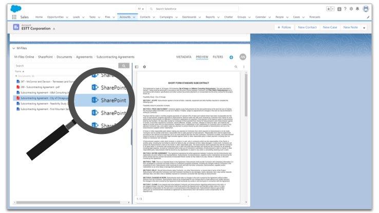 Salesforce-Nutzer können nun Dokumente und andere Dateien, die in SharePoint gespeichert sind, direkt in den vertrauten Account- und Opportunity-Ansichten in Salesforce anzeigen. Hier können sie auch neue Dokumente in SharePoint anlegen und bearbeiten, ohne zwischen den Anwendungen hin und her springen zu müssen. Das steigert die Effizienz und Produktivität der Benutzer erheblich. Darüber hinaus können Salesforce-Nutzer mithilfe der Suche SharePoint-Sites durchsuchen. Durch die Unterstützung von M-Files for Salesforce können Benutzer Dokumente einfach mit Tags versehen oder mit Salesforce-Objekten wie Accounts, Leads, Contacts oder Opportunities verknüpfen.