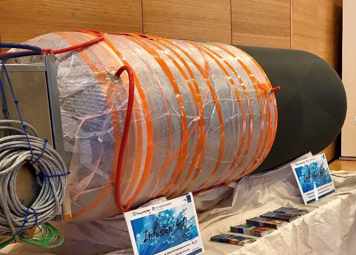 Mit CFK-Boostergehäusen fertigt die MT Aerospace AG in Augsburg große CFK-Bauteile (carbonfaserverstärkter Kunststoff) in der Raumfahrt im Vakuuminfusionsverfahren. Bei der Vakuuminfusion wird eine trocken gewickelte Vorform in einem Vakuumsack durch Harz infiltriert, und währenddessen werden die Elemente in einem Ofen langsam gedreht. Um die Fließfront des einströmenden Harzes zu überwachen und Prozesse zu optimieren, wird eine intelligente Sensorik benötigt. Wissenschaftler aus dem Fraunhofer LBF bringen zu diesem Zweck mit dem Industriepartner Glasfasersensoren bereits beim Wickeln in das Bauteil ein, die dann in diesem wichtigen Fertigungsschritt die Harzverteilung kontrollieren.
