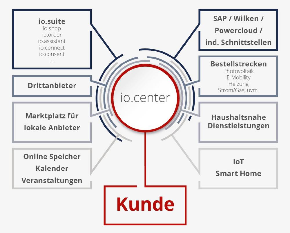 Das White-Label-Kundenportal io.center eröffnet die Möglichkeit, durch die Analyse aller freigegebenen Daten, konkrete Mehrwerte durch den Einsatz von KI und Affinitäten anzubieten – natürlich nur auf Wunsch des Kunden. Hierbei geht es explizit nicht um blinde Daten- Sammelwut, sondern um ein personalisiertes Informations- und Produktangebot. Selbstverständlich können auf Knopfdruck auch alle Bestellstrecken und Planungstools der Produktfamilie io.suite integriert werden, sowohl für Commodity- als auch Non-Commodity-Produkte.