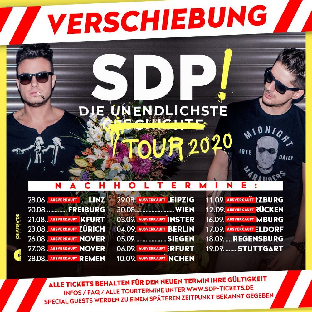 Zu ihrer letzten Tour pilgerten insgesamt mehr als 130.000 Fans, die Jubiläums- Show in der Berliner Wuhlheide im August 2019 mit 17.000 Besuchern war nach nur 20 Tagen restlos ausverkauft. Was lang ersehnt wurde, ist nun endlich offiziell: SDP gehen 2019 mit neuem Album auf Tour!