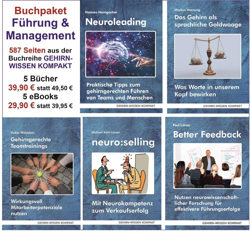Das Buchpaket besteht aus fünf Taschenbüchern und kostet 39,90 € statt 49,50 € (Fünf eBooks kosten 29,90 € statt 39,95 €). Man spart also rund 20% bei der Taschenbuch-Variante oder 25% bei den eBooks. Wer die interne Kommunikation voran bringen will und sein Leadership auf der Basis aktueller Erkenntnisse der Gehirnforschung neu gestalten möchte, ist mit diesem Taschenbuch- oder eBookPaket (587 Seiten) sehr gut aufgehoben.