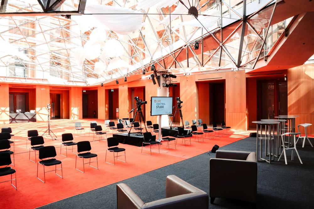 Das großzügige und mit direktem Tageslicht ausgestattetet Studio befindet sich in der AXICA, direkt am Brandenburger Tor in Berlin. Es verfügt über eine Studiobühne mit LED-Bühnenrückwand, eine Grundausstattung an Designer- und Bühnenmobiliar, professionelle Medientechnik sowie eine Licht-, Ton- und Bildregie. Besonders interessant für Eventplaner: Dank modernster Technik ist neben der Zuschaltung von Gastrednern und Experten via HD-Video auch die Durchführung von Abstimmungen sowie Q&A Sessions möglich. Auf Wunsch kann das Studio außerdem individuell umgestaltet werden, so dass die Corporate Identity eines Unternehmens für alle Teilnehmer des Events sichtbar wird.