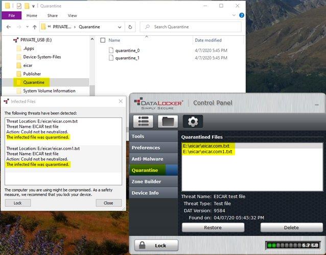 Ist ein Sentry K300 mit dem optionalen Anti-Malware-Scanner von McAfee ausgestattet, steht die neue Funktion Anti-Malware-Quarantäne zur Verfügung. Dadurch wird das Speichern einer erkannten, potentiell gefährlichen Datei im sicheren Quarantäne-Bereich auf der verschlüsselten Partition des Sentry K300 unterstützt. Von dort kann die Datei dann endgültig gelöscht oder wiederhergestellt werden, falls sie sich als ungefährlich herausstellen sollte. Auch diese Aktivitäten sind jederzeit in den Compliance-Berichten nachvollziehbar.