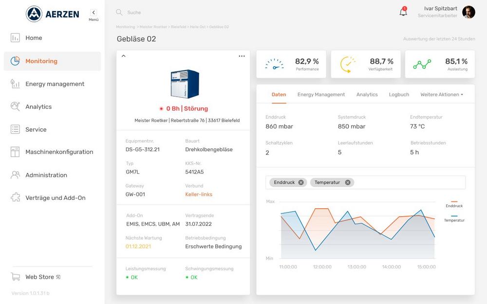 As a basic package AERZEN offers the user-friendly Machine Park Management. Users can see all active plants on an interactive world map and can select them specifically. This allows you to see at a glance which machines are in operation, when maintenance is due or where a fault may be present. In the monitoring menu the user can view the relevant process parameters in detail: Diagrams and trend displays provide information about performance, availability and utilisation of machines. Sensitive and customer-specific process data is always protected during live transmission, data ownership remains with the customer at all times. For the operator, the central plant management reduces time and cost-intensive on-site appointments.