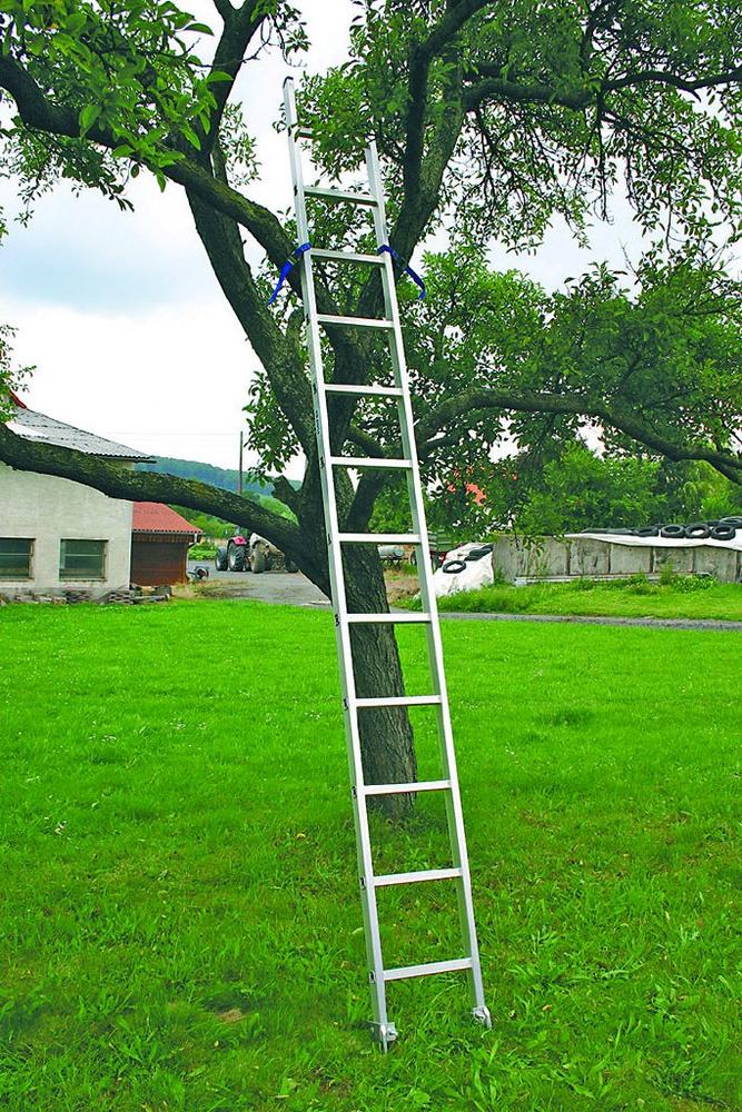 - Am besten die Leiter am Baumstamm anlegen und gegen Wegrutschen und Umkippen sichern. Dazu eignet sich ein Zurrgurt, der am Leiterkopf und am Stamm oder an einem Ast befestigt wird. Soll die Leiter an einem Ast angelegt werden, vorher prüfen, ob dieser dafür stabil genug ist und ob beide Leiterholme verlässlich aufliegen.