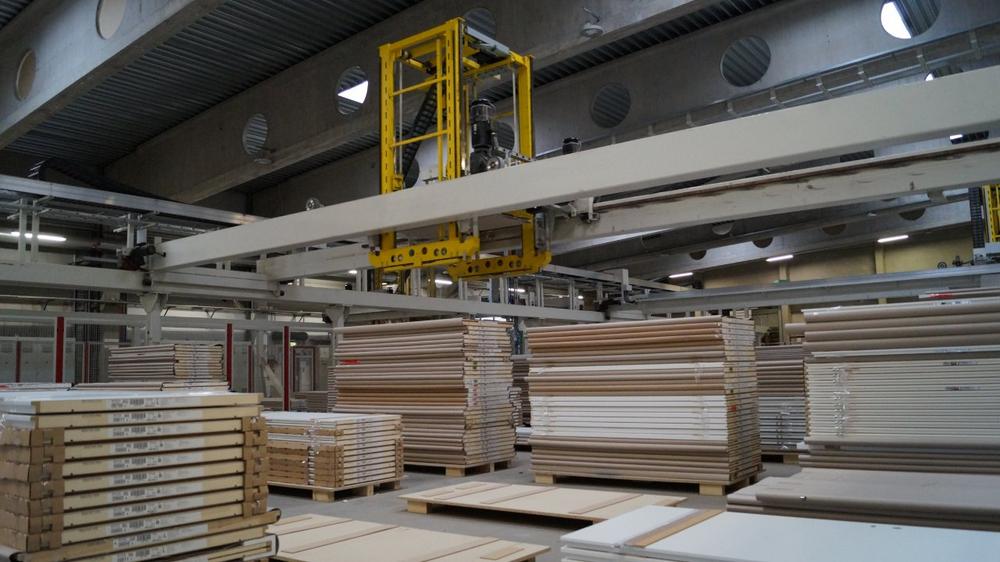 By means of a clamping frame adjustable to the respective length, the door leafes are clamped at the head end and thus can be separated effortlessly. Sometimes a combination of clamp and vacuum transport is also used. The singling or resorting is necessary, because the upstream production lines produce in a cut-optimized way, and therefore the orders cannot be worked-off according to the customary picking orders. For this reason it is necessary that the doors coming from the production line are first singled again in the SYSTRAPLAN system and are then assigned to the respective customer picking order. Upon storing the system is supported by an additional scanner portal, which records all needed product information fully automatically via a barcode. Once the data has been recorded, they are made available to the higher ranking warehouse management, and storage and allocation via storage gantry (gantry 1) can begin. In the next area of the area storage, which comprises two bridge portals (portal 2.1 and portal 2.2) with single board and stack transport, priority is given to rearrangements and pre-picking. This area also contains a section for "standard goods" for large customers with high purchase numbers. All sections are connected by various roller conveyors enabling the transfer to other sections and the discharging of completed picking orders.