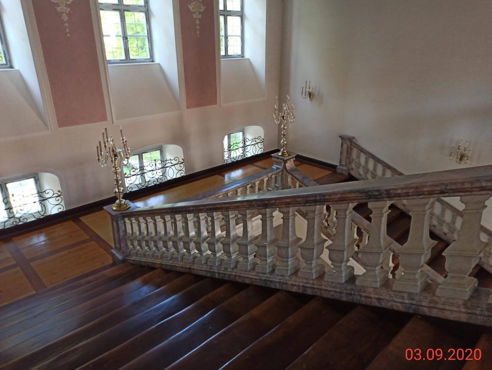 Nach einer intensiven Planungsphase unter Einbeziehung der Denkmalschutzbehörden durch Architekt Klaus Zöttl, Augsburg, erfolgte die statische Ertüchtigung nach Berechnungen von Dipl.-Ing. Michael Burz vom Ingenieurbüro Roll in Kaufbeuren. Das Spezialgerüst im Treppenauge wurde von Schleifer Gerüstbau aus Romatsried errichtet, die Abstützung der Stuckornamentik unter den Treppenläufen brachte Stuckateurmeister Herbert Haug aus Friesenried an. Den Aus- und Einbau der Tritt- und Setzstufen über die offengelegte Wangenseite und die denkmalfachliche Reparatur aller Treppenteile bewerkstelligte Schreinermeister Andreas Angerer aus Irsee. Kirchenmaler Isidor Hefele aus Stockheim schließlich restaurierte mit seinem Kollegen Heinz Olbrich die marmorierten Holzbaluster und besserte einzelne Fehlstelle im Farbbereich von Decke und Wänden aus.