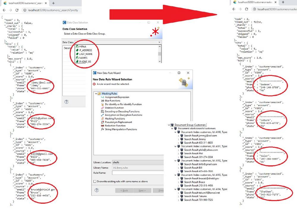 Der Such- und Maskenassistent Elasticsearch in der grafischen IDE der IRI-Workbench für IRI DarkShield verwendet die gleichen Werkzeuge wie die in diesem Artikel beschriebenen MongoDB- und Cassandra-Konnektoren. Dieser Assistent kann verwendet werden, um PII und andere sensible Informationen in Elasticsearch-Sammlungen zu klassifizieren, zu lokalisieren und zu de-identifizieren oder zu löschen und um Such- und Prüfergebnisse zu erzeugen.