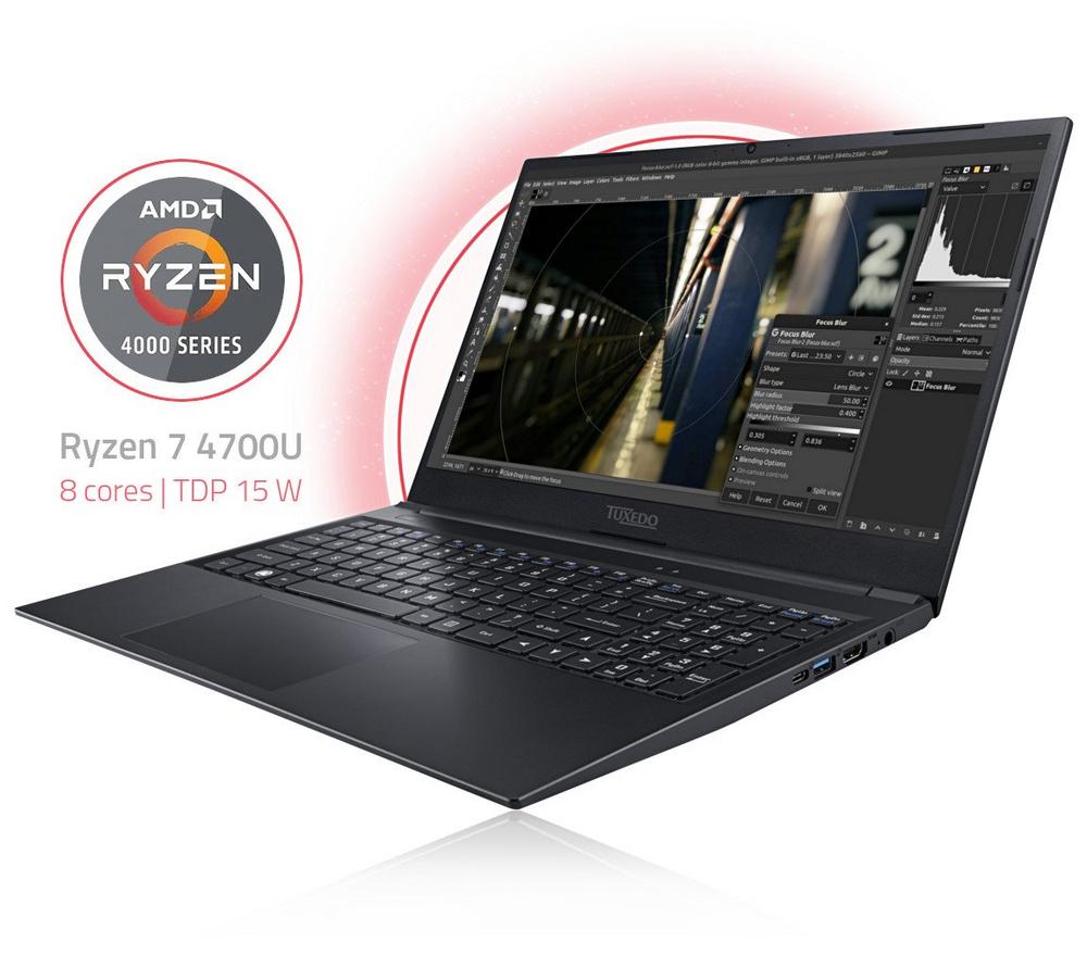 Im TUXEDO Aura 15 kommt einer der schnellsten Vertreter AMDs neuer Ryzen 4000U – Serie zum Einsatz: Der AMD Ryzen 7 4700U arbeitet mit 8 CPU-Kernen und taktet dabei mit einer Arbeitsgeschwindigkeit von bis zu 4,1 GHz.