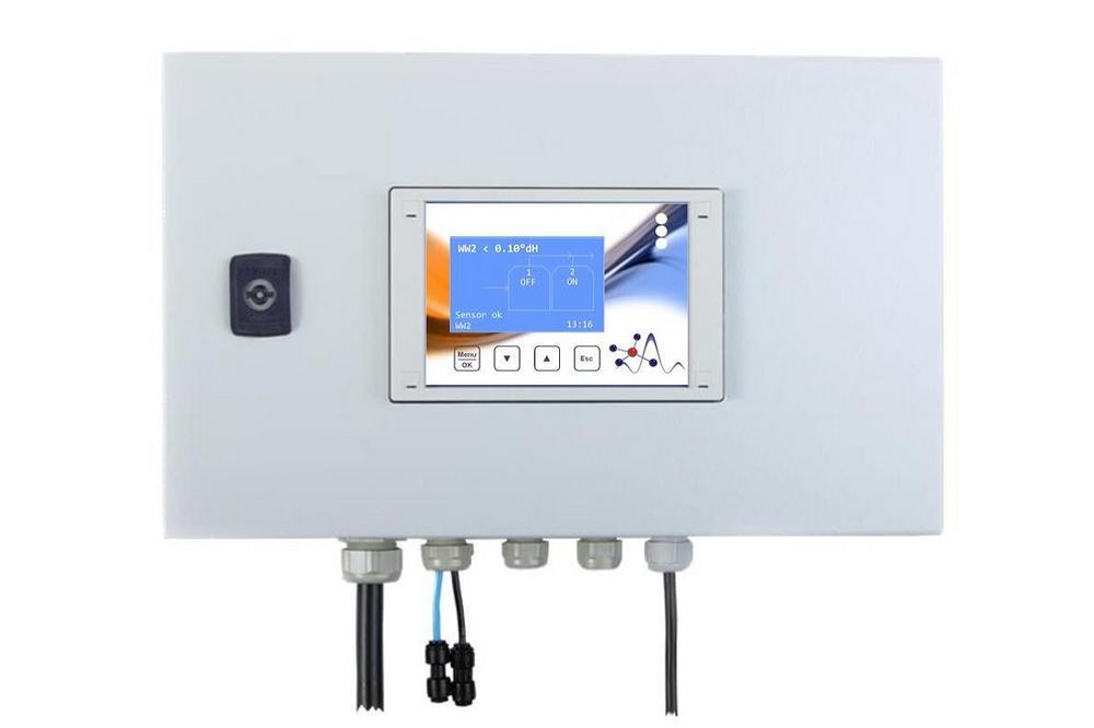 Vor Ort sind Gerätestatus und Härtebewertung im Display übersichtlich ablesbar. Zu höheren Prozessebenen findet eine Datenkommunikation per LAN-Datenschnittstelle (Modbus) statt. Die Speicherung der betrieblichen Daten erfolgt im auslesbaren USB-Stick.