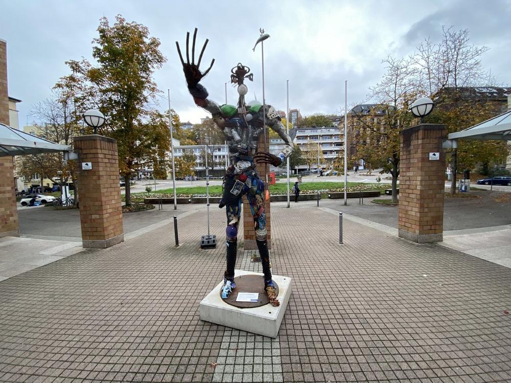Der „Plastikmensch“ des Künstlers Thomas Rees legt die Finger in die Wunde der modernen Gesellschaft: Unmengen von Plastik und Unrat gelangen täglich in die Natur. Durch die Corona-Pandemie ist der Plastikkonsum weiter gestiegen. Für den regionalen Energie- und Umweltdienstleister badenova ein Grund, seinen „Plastikmenschen“ immer wieder an verschiedenen Orten aufzustellen. Bereits seit dem Sommer 2018 ist er auf Reisen. Vergangene Woche am 28. Oktober wurde das symbolträchtige Kunstwerk vor dem Ministerium am Kernplatz 9 platziert. Das Ministerium für Umwelt, Klima und Energiewirtschaft, darin das Referat 23, „Kreislaufwirtschaft, Recht“, hatte das Kunstwerk bei der badenova angefragt. Es steht bis 23. Dezember 2020 dort und wird die Besucher des Ministeriums sowie Passanten auf die Schattenseiten der Konsumgesellschaft hinweisen.