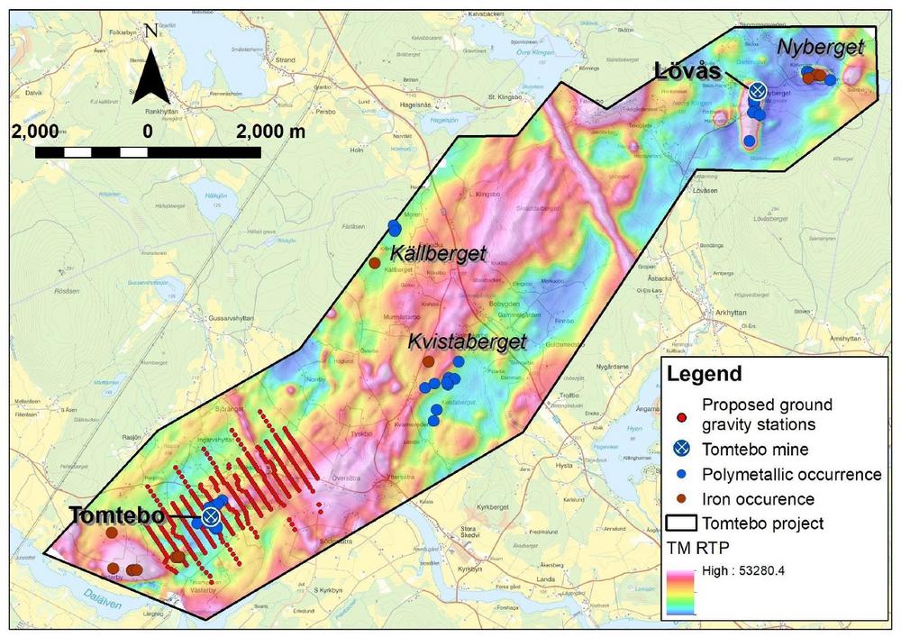 District Metals Corp. (TSX-V: DMX) (FRA: DFPP); („Distrikt" oder das „Unternehmen") gibt bekannt, dass eine Gravitationsuntersuchung am Boden auf der Liegenschaft Tomtebo im Bergbaubezirk Bergslagen in Südmittelschweden begonnen wurde. Diese Gravitationsuntersuchung konzentriert sich auf den Minentrend Tomtebo (Abbildung 1). Dieser Trend wurde mittels zahlreicher Leitfähigkeitsanomalien und starker Magnetik-Anomalien abgegrenzt, die im Rahmen einer SkyTEM-Erkundung im Juli 2020 identifiziert wurden.