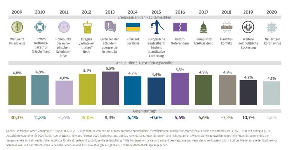 Mit seinem breit gestreuten flexiblen Ansatz hat der Income-Klassiker JPMorgan Investment Funds – Global Income Fund das herausfordernde Jahr 2020 mit einer Entwicklung von 1,6 Prozent abgeschlossen und konnte alle pandemiebedingten Verluste aufholen. „Wir haben den Anlegern im Global Income Fund stets zu Ruhe und Geduld geraten – und diese Tugenden sollten sich auch weiterhin auszahlen“, betont Witschel.