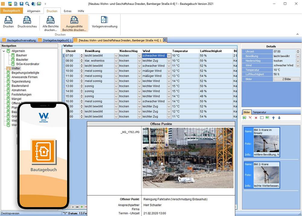 Programme wie das Bautagebuch 2021 von Weise Software unterstützen Planer bei der Dokumentation von Baustellenaktivitäten, von Behinderungen oder Mängeln. Sie reduzieren den Arbeitsaufwand und mögliche Fehlerquellen, die durch die manuelle Erfassung und spätere digitale Eingabe und Zuordnung häufig entstehen. Strukturierte Abfragen, Vorlagen und Automatismen rationalisieren Arbeitsabläufe und stellen sicher, dass Wichtiges nicht vergessen wird. Die neue Version 2021 des Bautagebuchs dokumentiert alle Leistungen, Lieferungen, Tätigkeiten und die jeweiligen Arbeitsbedingungen auf der Baustelle. Erfasst werden anwesende Firmen, ausgeführte Arbeiten, Materialeingänge, Mängel, Behinderungen, Nachträge und Änderungen, Messungen, besondere Vorkommnisse, das Wetter und anderes mehr. Auch Baubesprechungen können protokolliert und die Ergebnisse an Beteiligte und Betroffene versandt werden. Baustellenfotos lassen sich verwalten und bearbeiten, beispielsweise können Teile des Bildes hervorgehoben, markiert und beschriftet werden. Das Bautagebuch 2021 verursacht weder laufende Kosten – etwa durch ein Abonnement oder Serverkosten – noch ist es laufzeitbeschränkt. Anwender können beliebig viele Bautagebücher, Bautages- oder Baustellenberichte erstellen, das Layout von Berichten über vordefinierte Layoutvorlagen wählen oder an individuelle Anforderungen anpassen. Über eine integrierte Profilverwaltung lässt sich das Bautagebuch 2021 für unterschiedliche Anforderungen und Nutzergruppen, zum Beispiel für Planer, Bauleiter, Bauunternehmer, Handwerksbetriebe, Sachverständige oder Bauherren passend zuschneiden.