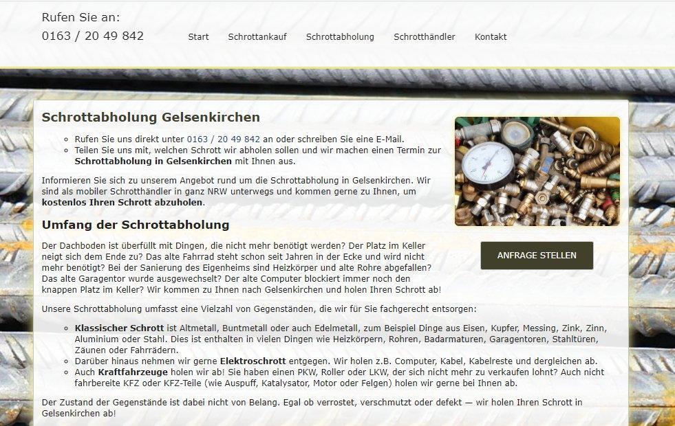 Die Schrottabholung Gelsenkirchen kauft Schrott aller Art bei seinen privaten und gewerblichen Kunden in Mühlheim und dem gesamten Ruhrgebiet an. Er ist in der Lage, den Unternehmen die entsprechenden Nachweise zur Verfügung zu stellen und kümmert sich im Nachgang an den Schrott-Ankauf beziehungsweise die Schrottabholung um die fachgerechte Sortierung und Verbringung zu den Wiederaufbereitungsanlagen.