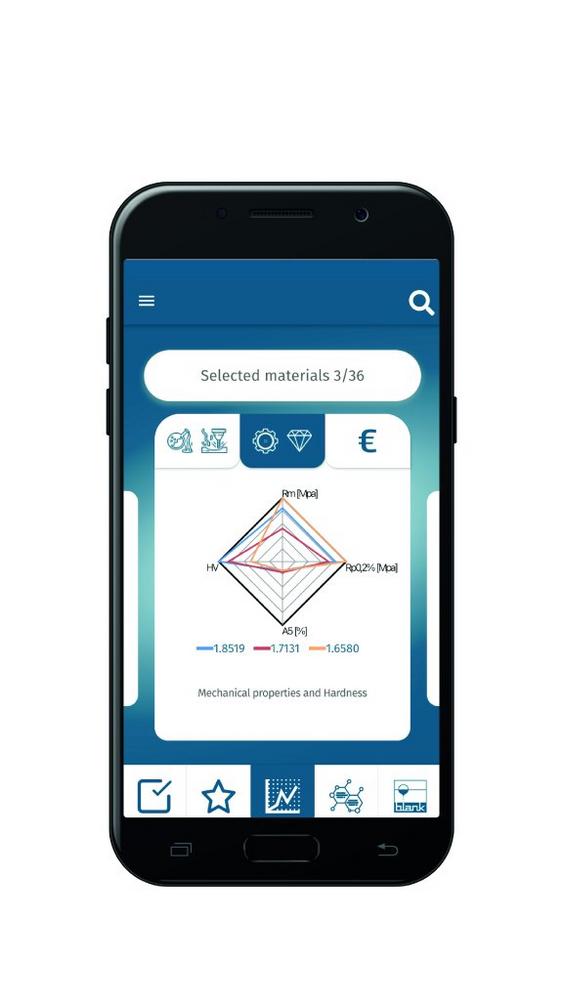 "Smart Material" bundles the material expertise of the BLANK-Group and enables the user to select interesting materials easily and intuitively. In the first step, mechanical and physical properties that are required for the use of the later component can be selected. Hardness and corrosion resistance are also criteria that must be taken into account. In addition to these specifications, information on further processing, such as machinability or weldability, can also be selected. However, it is also possible to select according to later areas of application, such as use in medical technology, in gearboxes or in stamping tools. The app then displays the materials in question. These are compared with each other graphically and clearly with regard to certain properties in order to be able to make the best choice for the desired application.