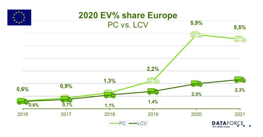 In Europe the ratio of commercial vehicles sold with electrical propulsion is trailing behind passenger cars with a 2,0% share vs their 5.9% share over 2020.