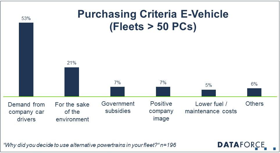 However, when it comes to the most important reason, the picture changes. The most frequently named reason was the demand of company car drivers. Especially in large fleets, they are driving the "E" issue – certainly not least because of the huge tax advantages in payrolls.