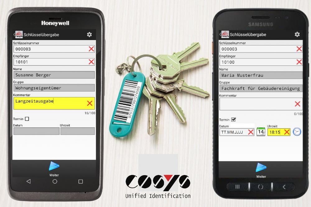 Die Schlüssel identifizieren Sie entweder über kleine Barcode-Etiketten oder über eindeutige Schlüsselnummern. Die Zuordnung von Schlüssel zu Barcode können Sie sowohl über COSYS mobile App vornehmen als auch über COSYS WebDesk Tool.