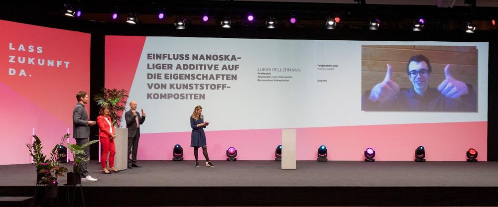 In seiner Arbeit erforschte der 18-Jährige den Einfluss von Nanopartikeln aus Aluminiumoxid auf das Bruchverhalten und die Härte von Kunststoff (Polyesterharz). Dabei konnte der Schüler des Alexander-von-Humboldt Gymnasiums in Schweinfurt auch auf die Unterstützung des Kunststoff-Zentrums SKZ in Würzburg zählen. Die Forscher des SKZ halfen mit Erfahrung und Geräten bei der Erweiterung seiner Schulversuche, insbesondere bei der Einarbeitung der Partikel, der Herstellung spezieller Prüfkörper sowie bei der Zugprüfung und der elektronenmikroskopischen Charakterisierung. „Die Kombination aus Schulversuchen mit Einblicken in die wissenschaftliche Praxis hat mir sehr gut gefallen“, sagt Lukas Dellermann. „Ohne die zusätzlichen Experimente mit den Prüf- und Analysemethoden sowie dem fachlichen Know-how des SKZ und des Fraunhofer ISC wären mir die Erfolge am Jugend-forscht-Bundeswettbewerb sicherlich nicht möglich gewesen. Daher kann ich allen Schülern/-innen eine enge Zusammenarbeit mit den Würzburger Forschungseinrichtungen nur empfehlen.“